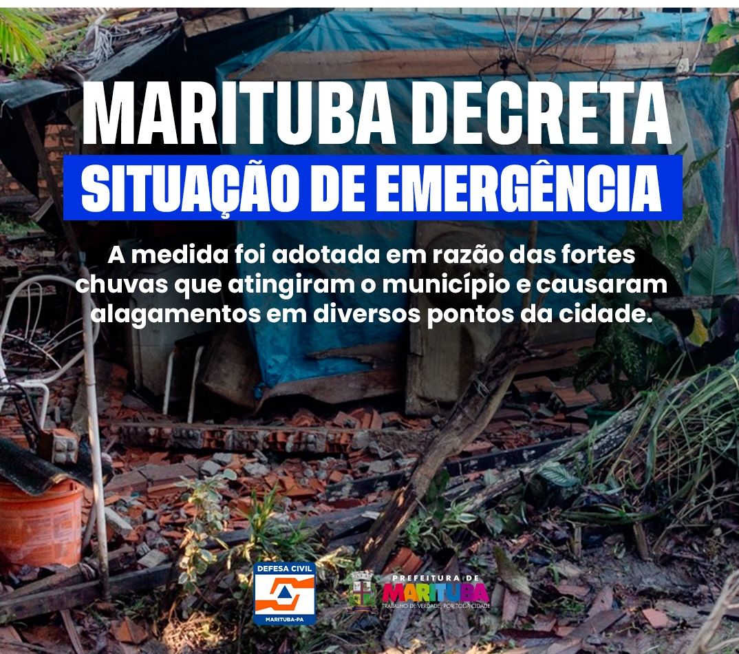 Após as enchentes ocorridas em Marituba, município que integra a região metropolitana da grande Belém, dia 23 de março, conforme publicação nas redes sociais da prefeitura, esta decretou ‘Situação de Emergência’ local. Tal situação decretada por uma prefeitura é um ato administrativo formal que reconhece a incapacidade parcial do município em responder a um desastre (natural, epidemiológico ou de desassistência) com os próprios recursos, permitindo a agilização de compras, contratações e a solicitação de apoio federal ou estadual.