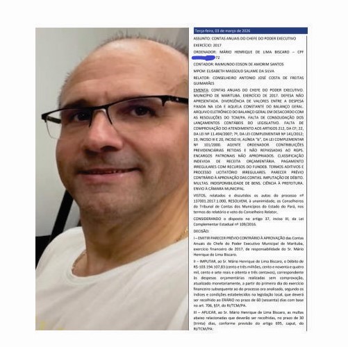 Nem bem procurou colocar o seu nome de volta na prateleira política de Marituba, dessa feita ao cargo de senador, o ex-prefeito de Marituba, Mário Henrique de Lima Biscaro, conhecido como Mário Filho, já sofreu uma intervenção do TCM do Pará, onde a corte emitiu parecer contrário às contas anuais do ex-prefeito no exercício financeiro de 2017. E ainda imputou ao Sr. Mário Henrique de Lima Biscaro, o débito de R$ 103.194.107,83 (cento e três milhões, cento e noventa e quatro mil, cento e sete reais e oitenta e três centavos), correspondente às despesas orçamentárias realizadas sem comprovação, atualizadas monetariamente, a partir do primeiro dia do exercício financeiro subsequente ao do processo ora analisado, segundo os índices e condições estabelecidos na legislação local, que deverá ser recolhido ao erário no prazo de 60 (sessenta) dias com base no art. 706, §5º, do RI/TCM/PA. E mais, aplicar, ao Sr. Mário Henrique de Lima Biscaro, as multas abaixo relacionadas que deverão ser recolhidas, no prazo de 30 (trinta) dias, conforme previsão do artigo 695, caput, do RI/TCM/PA: Ao FUMREAP, na forma do artigo 712, inciso II, do RI/TCM/PA: